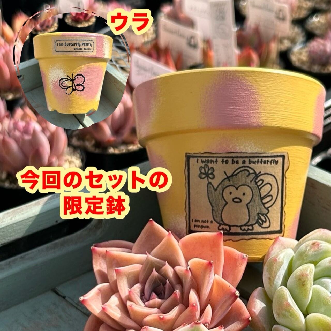Succulent Factoryオリジナルの限定バタフライ鉢(2.5号鉢)をセットにしたお得なセットです!